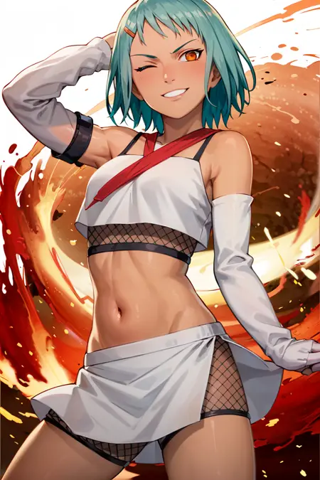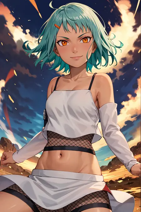 기본 프롬프트: fuu, 1girl, solo, hair ornament, orange eyes, hairclip, bare shoulders, collarbone, looking at viewer, aqua hair, fishnets, skirt, groin, detached sleeves, closed mouth, upper body