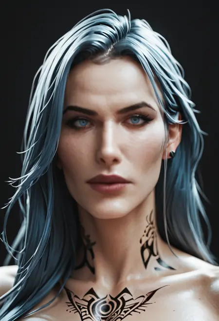 레븐의 특징 에는: 푸른 머리카락, 긴 머리카락, 푸른 눈, 문신, 창백한 피부(더 정확한 결과를 위해 이 특징들을 프롬프트에 추가하세요)가 포함됩니다.