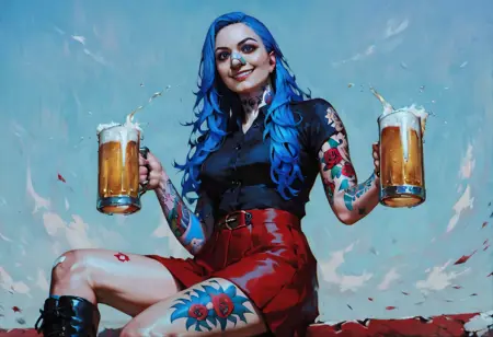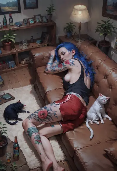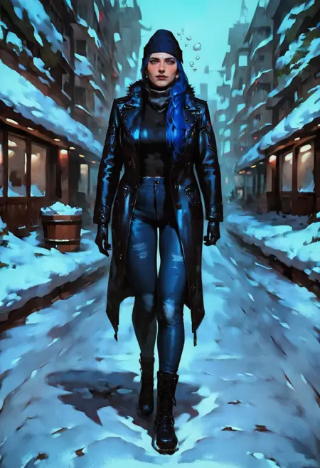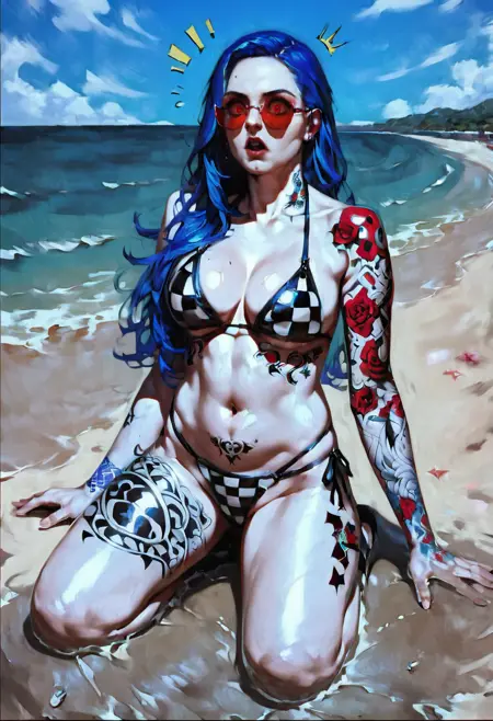 Raven’s features include: blue hair, long hair, blue eyes, tattoos, pale skin (add these features to the prompt for more accuracy).
