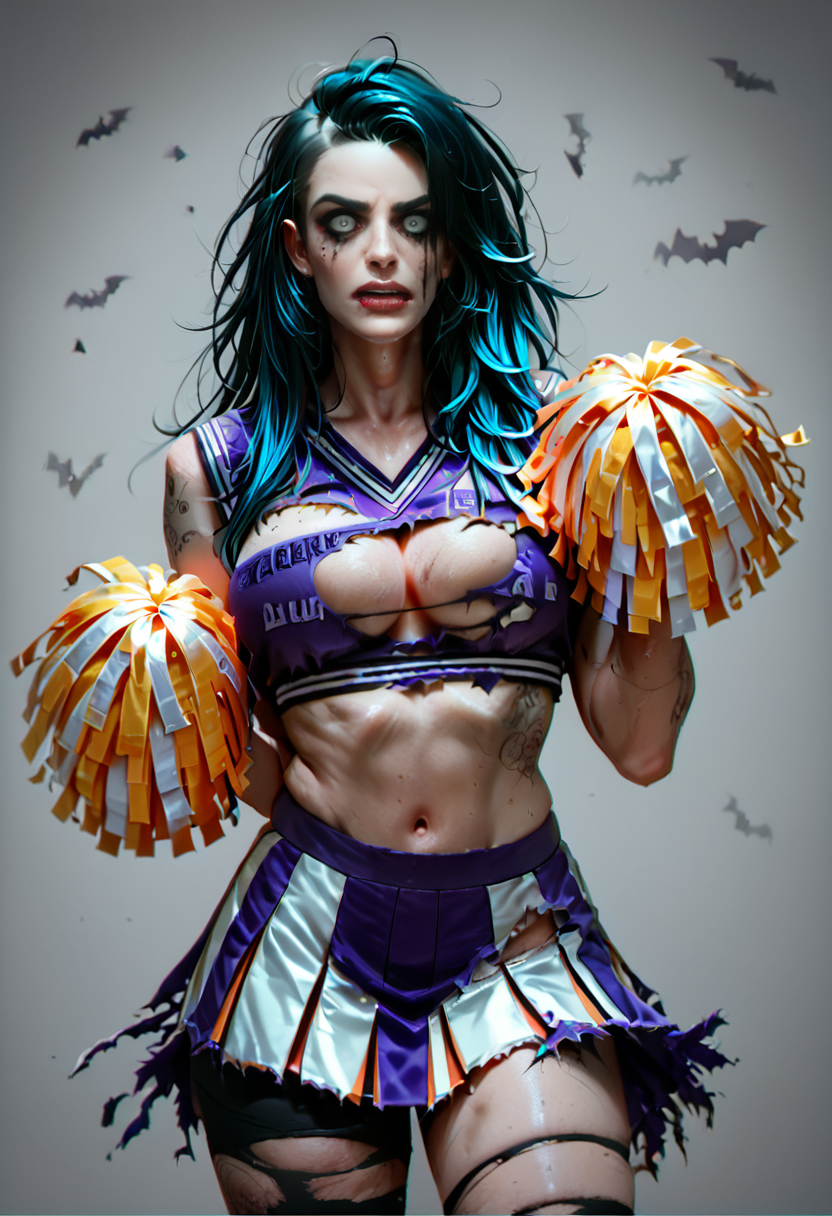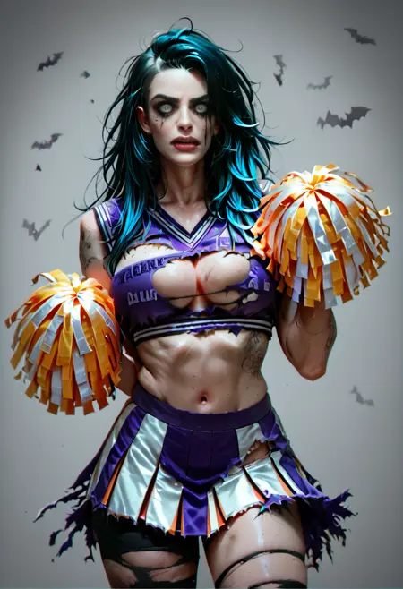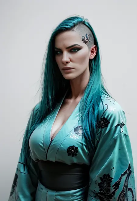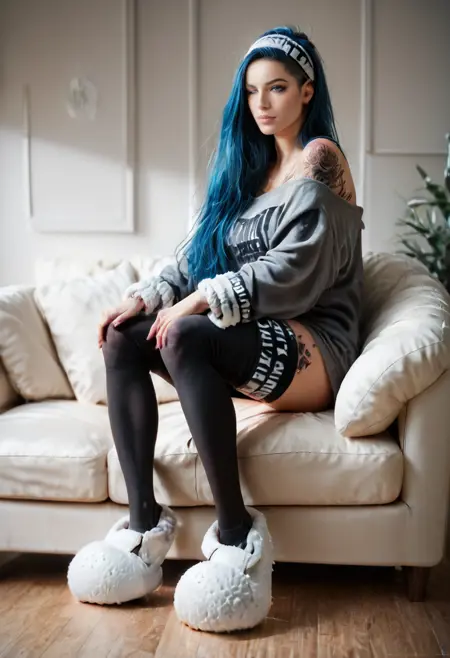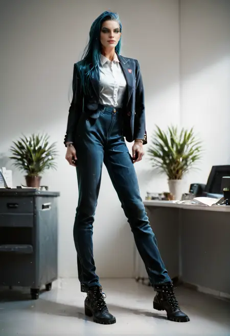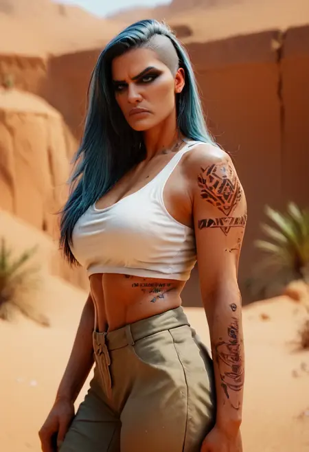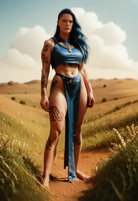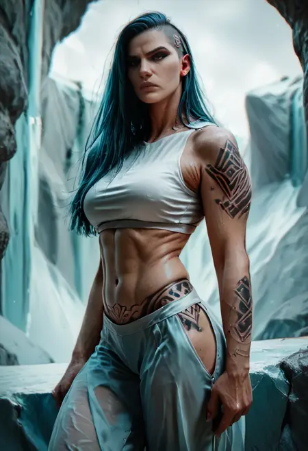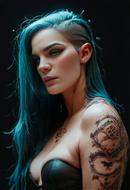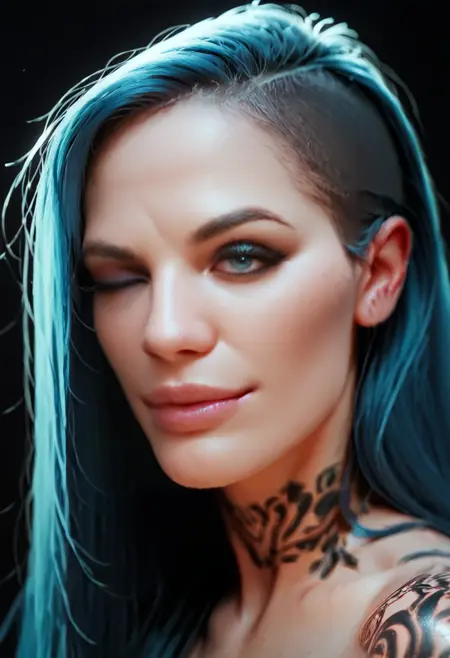 Raven’s features include: blue hair, long hair, blue eyes, tattoos, pale skin (add these features to the prompt for more accuracy).