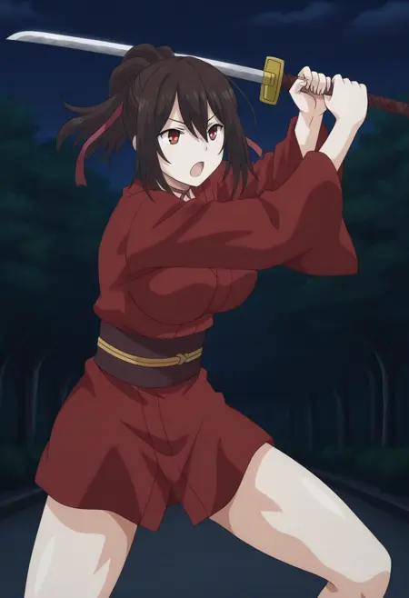 키워드: kunobotananm, 갈색 머리카락, 머리 띠, 단발머리, 붉은 눈, 목걸이, 짧은 키모노, 오비, 큰 가슴, 샌들, 실외, 숲, 서 있는, 전신, 진지한