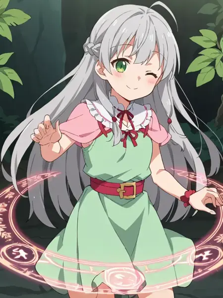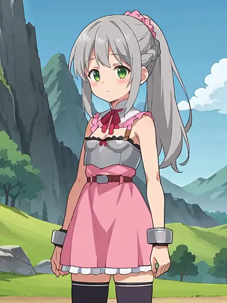 关键词:灰发,长发,马尾辫,编发,粉色发圈,绿眼睛,粉红色连衣裙,无袖,胸脯显露,分离式衣领,颈部丝带,盔甲,胸甲,护臂,黑色过膝袜,腰带