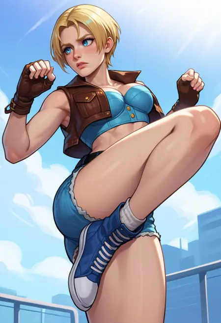 衣装の説明:短い髪、青色デニムのスポーツブラ、茶色のベスト、茶色の指先が開いた手袋、デニムショートパンツ、黒色のベルト、靴下、青色のスニーカー
