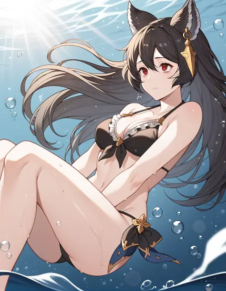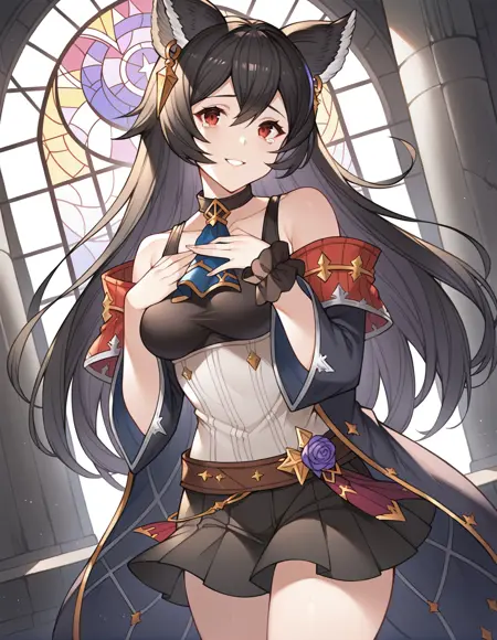 트리거 단어: nier \(granblue fantasy\), 1girl, erune, 붉은 눈, 눈 아래 다크서클, 검은 머리, 긴 머리, 동물 귀, 귀 고리, 보석
