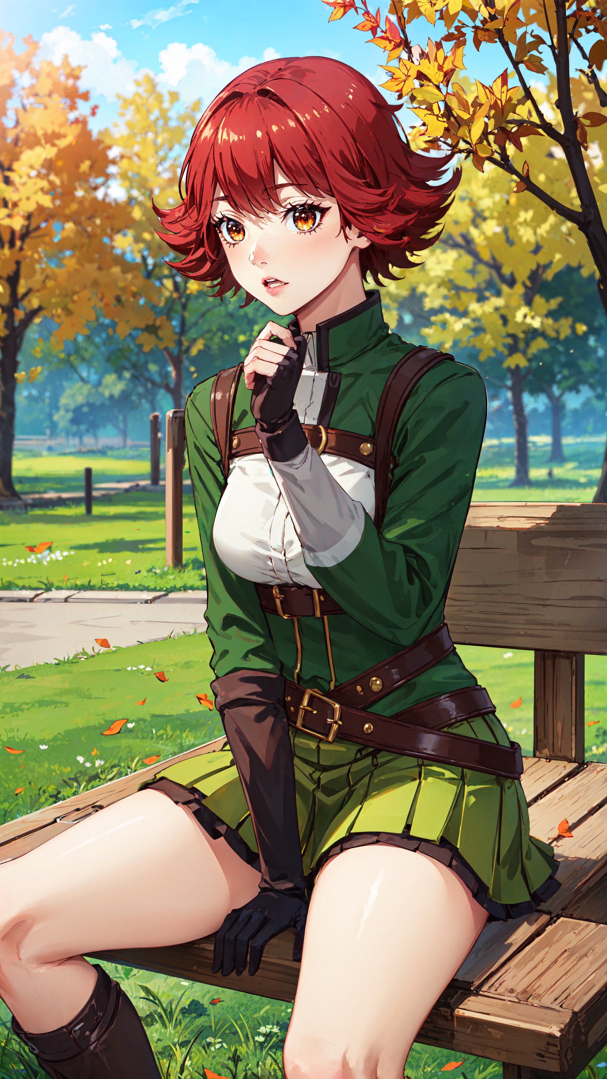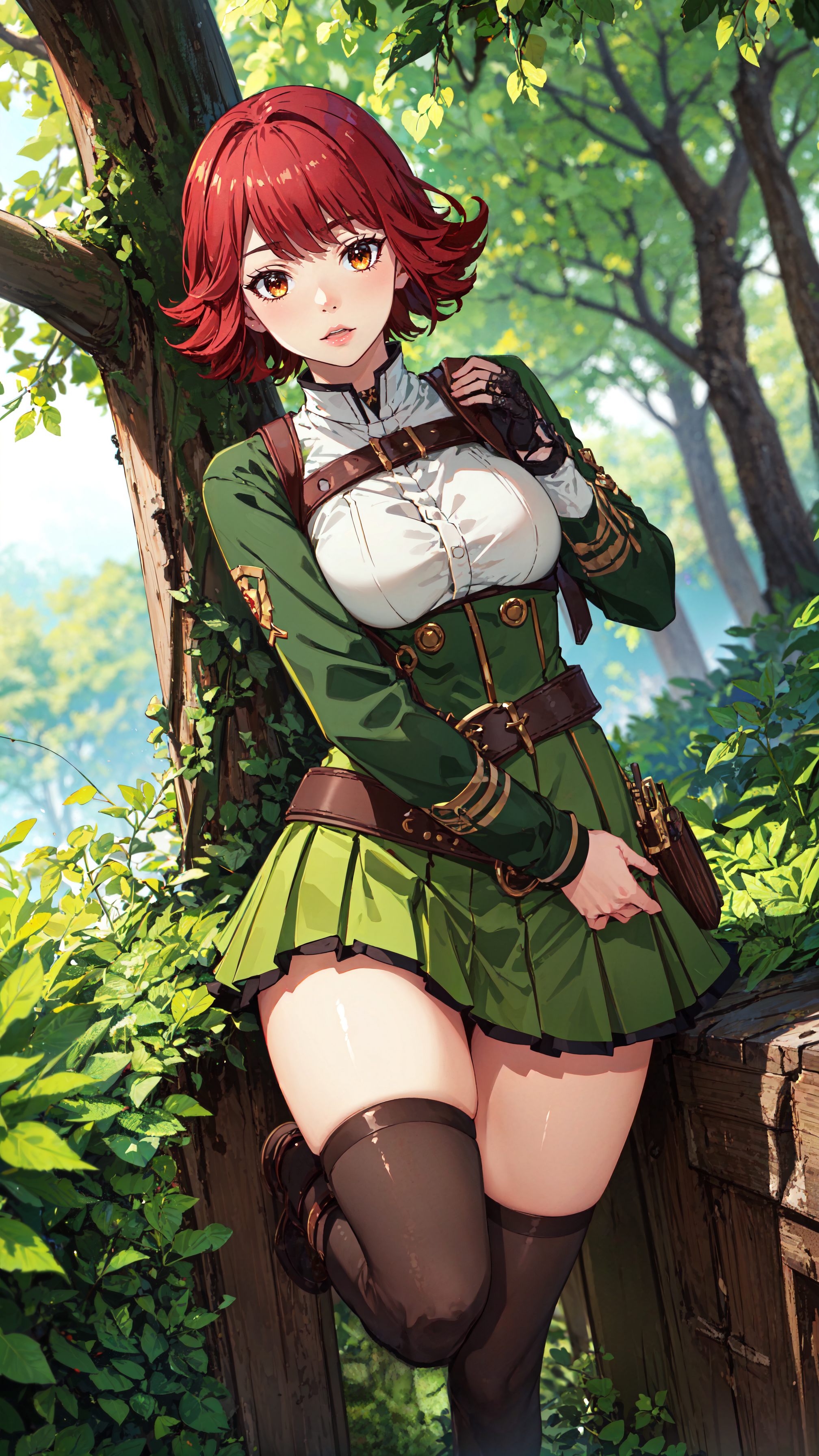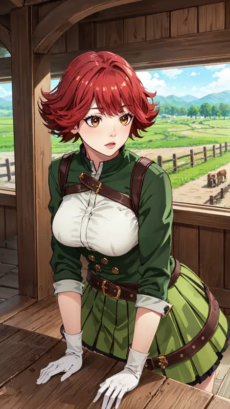 short hair, red hair, orange eyes, green and white outfit, belt, green skirt
