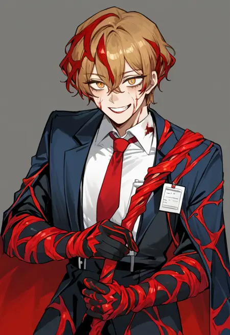 윈클레어임박한, ((밝은 붉은 덩굴, 드러난 살, 피)), 검은 코트, 빨간 넥타이, 검은 장갑, 검은 바지, 검은 신발, 흰 셔츠