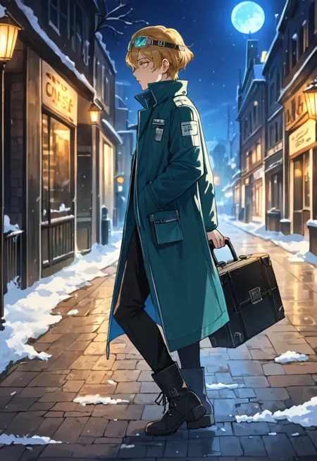 윈클레어데비아트, 안경, 머리에 안경, 청록색 코트, 벌어진 코트, 흰 재킷, 검은 바지, 검은 부츠, 긴 검은 캐리어 들고 있음
