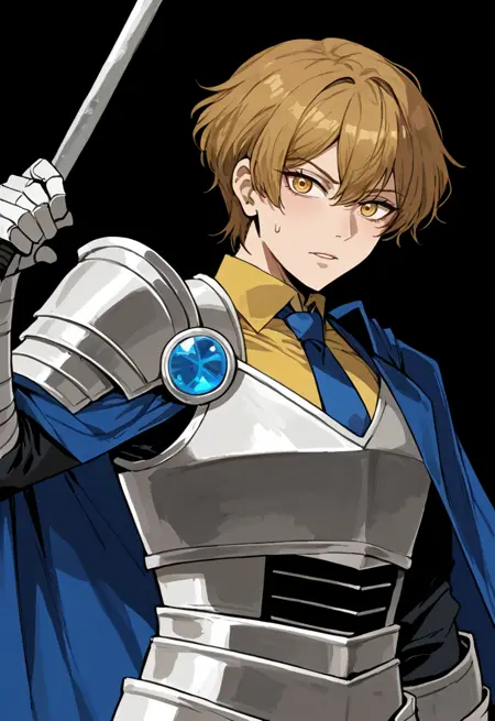 윈클레어츠바이, 흰 갑옷, 기사, 파란 망토, 노란 셔츠, 파란 넥타이, 칼 들고 있음, 거대한 검