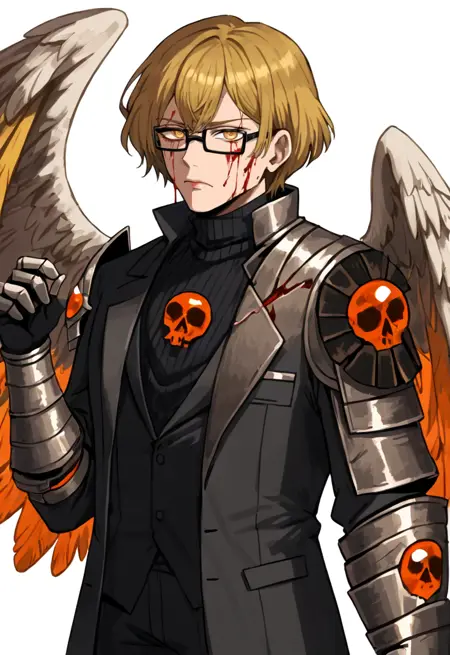 SinclairPhilip, black pants, grey jacket, black sweater, black gloves, brown footwear, feathered wings, sword, square glasses, one hand armor, shoulder armor