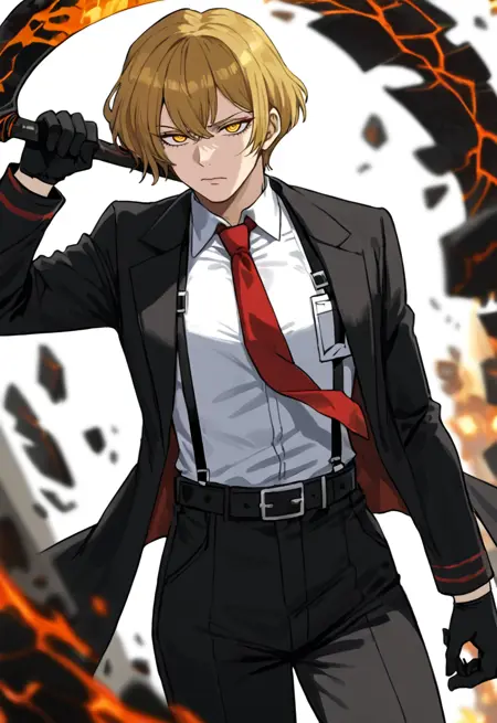 Sinclair9:2, black gloves, red pants, red coat, fire, open coat, fire horns