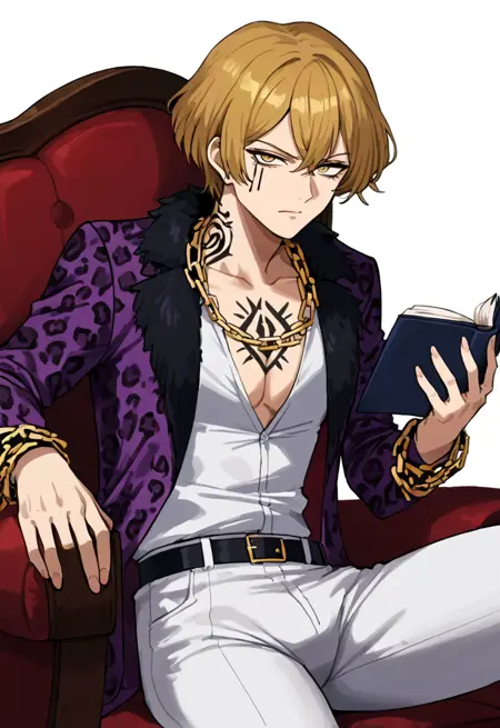 SinclairMiddle, tattoo on body, tattoo on face, chest tattoo, golden chains, white shirt, white pants, purple footwear, purple coat, open coat, fur trim, leopard print, book