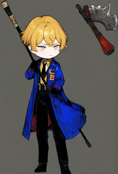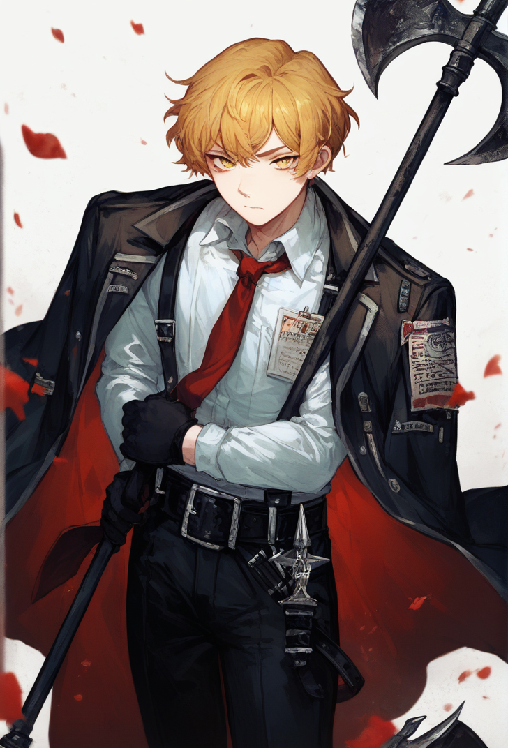 윈클레어죄인, 검은 코트, 빨간 넥타이, 검은 장갑, 검은 바지, 검은 신발, 흰 셔츠, 핼버드