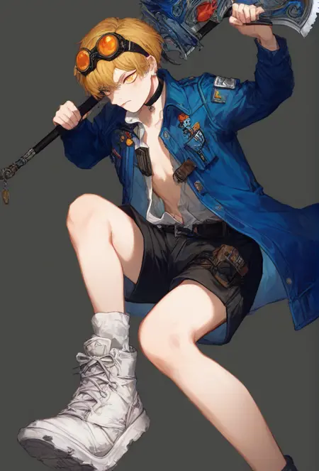 윈클레어모라르, 검은 반바지, 파란 재킷, 머리에 안경, 벌어진 옷차림, 흰 신발, 체인소