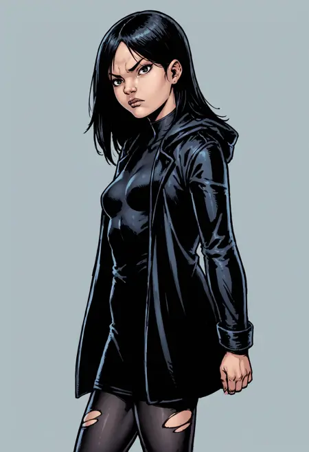 tf3ilf, 1girl, black hair, long hair, coat, shirt, pantyhose, boots,