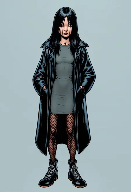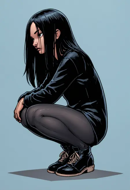 tf3ilf, 1girl, black hair, long hair, coat, shirt, pantyhose, boots,