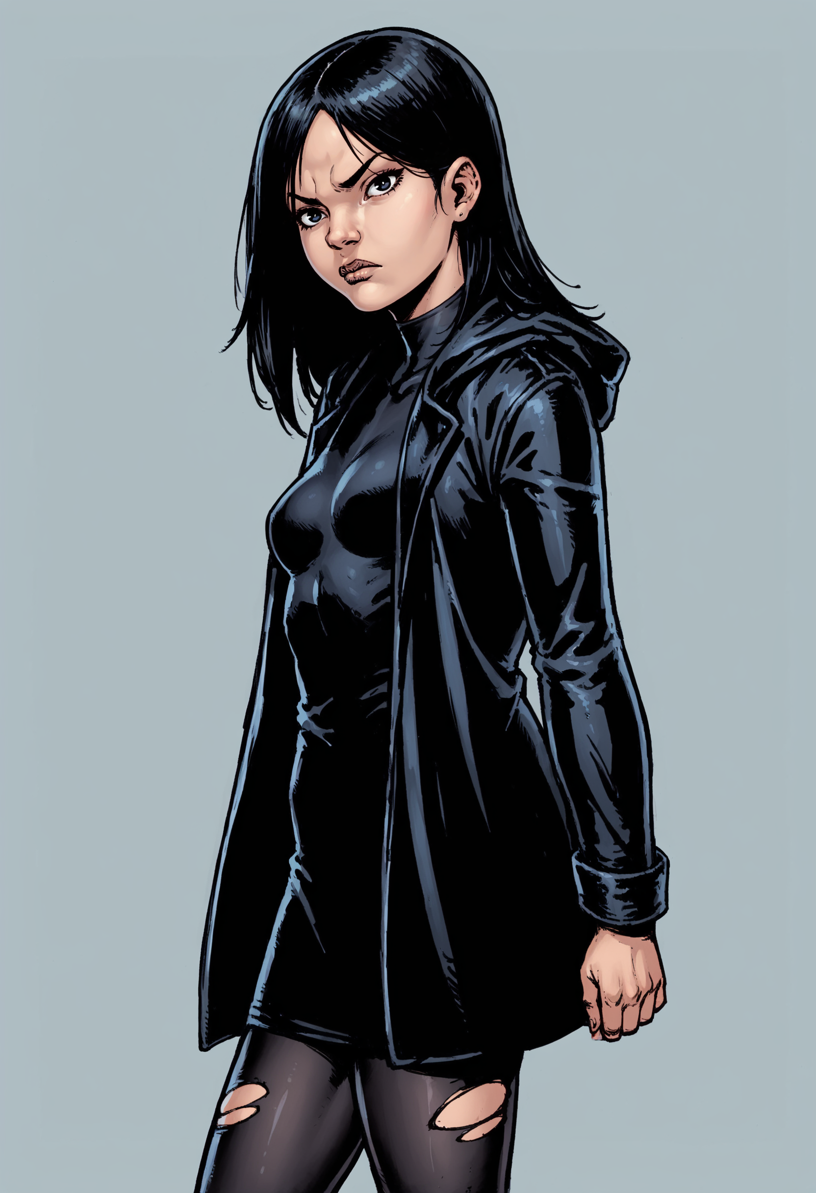 black shirt, black footwear, black tights, torn tights