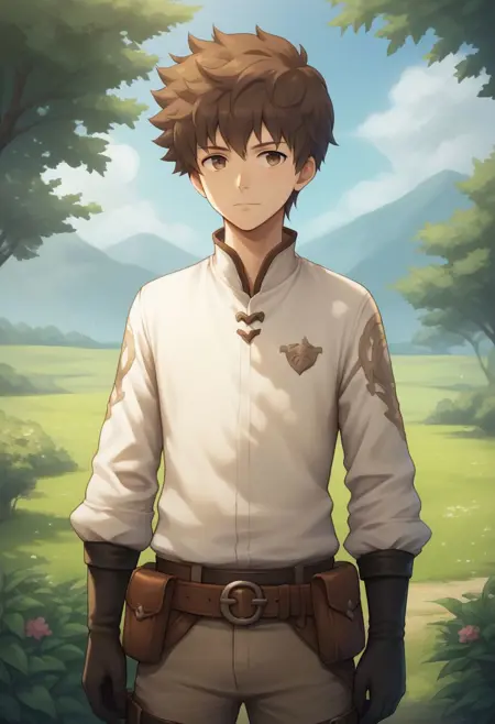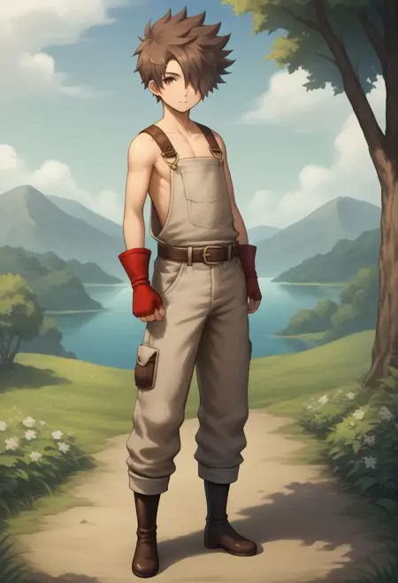 티즈, 단독, 장갑, 1명의 남자, 남성 중심, 손가락 없는 장갑, 빨간 장갑, 한쪽 눈 위의 머리카락, 갈색 눈, 돌기 있는 머리, 오버올, 갈색 머리, 벨트,