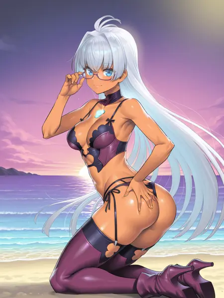 Tags (others): adjusting eyewear, elbow gloves, high heels, forehead protector cover eyes, floating hair, chibi, lipstick