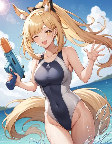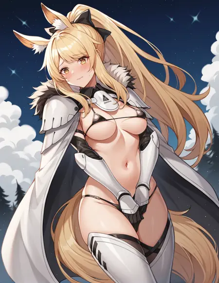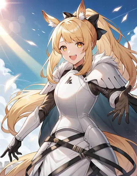 触发词:blemishine \(arknights\), 1girl, 马耳, 动物耳绒毛, 金发, 长发, 马尾, 侧发, 黄眼睛, 马尾