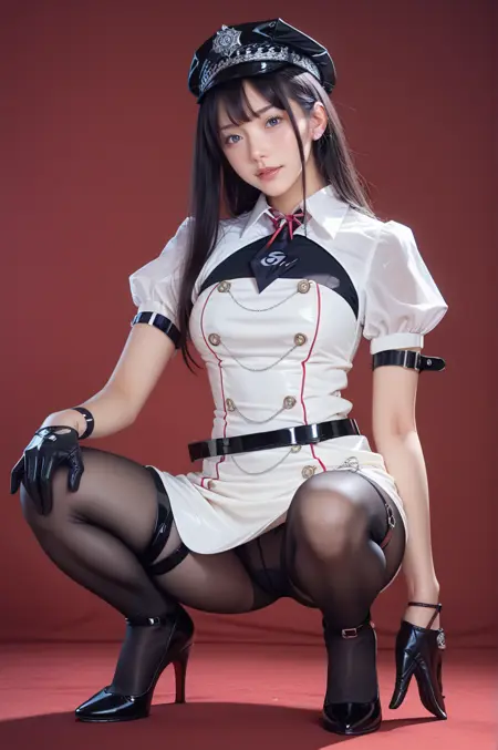 arm strap,puffy short sleeves,belt,half gloves,buttons,jewelry,thigh strap,white skirt,black pantyhose