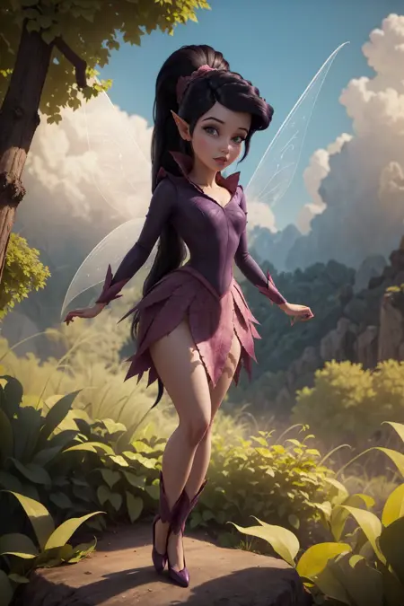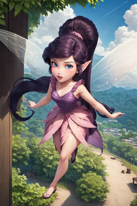Vidia, long wings, purple clothes, extra long ponytail, pointy ears, grey eyes,