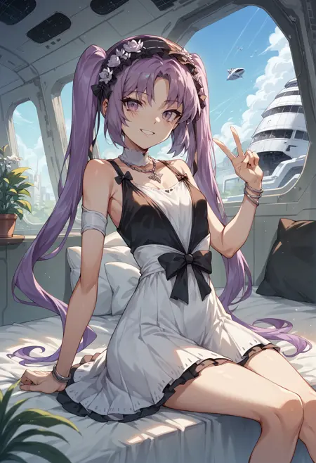 欧律阿勒: 小胸,双马尾,长发,紫色头发,紫色眼睛,黑色头饰,白色发饰,短裙,项链,首饰,黑色花朵,丝带