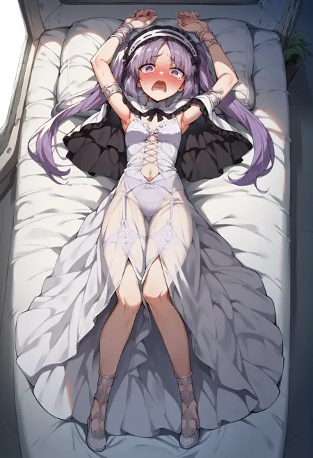 斯忒诺: 小胸,双马尾,长发,紫色头发,紫色眼睛,白色头饰,长裙,分离式领饰,短披肩,首饰,透视,内衣