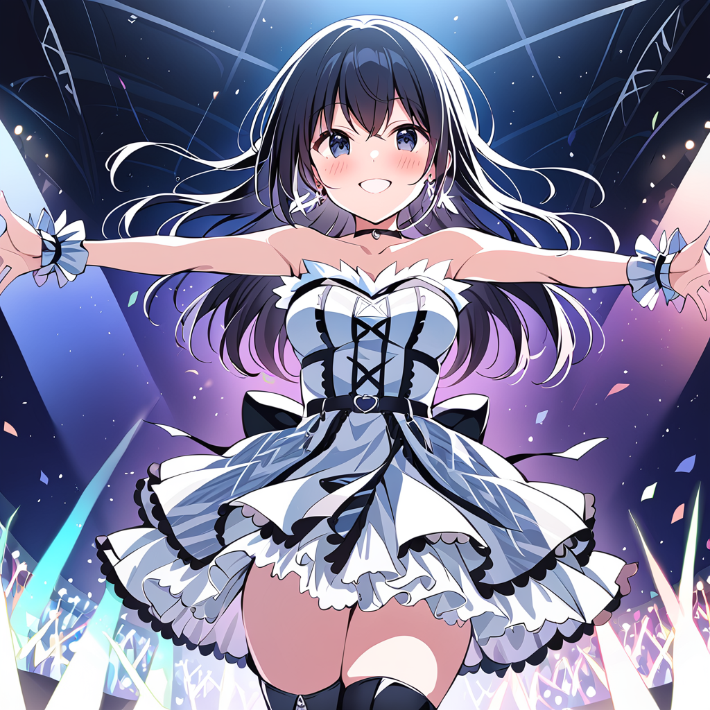 nagasemana, 1girl, nagaseman strapless dress, nagasemanidoly wrist cuffs, nagasemanidoly earrings, nagasemanidoly choker, nagasemanw thigh boots,