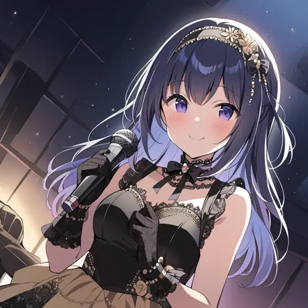 1girl, nagase mana, solo, smile, xzne1 costume, feather earrings, pendant choker, black thigh boots, wrist cuffs,