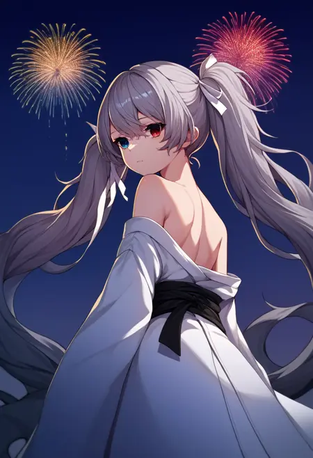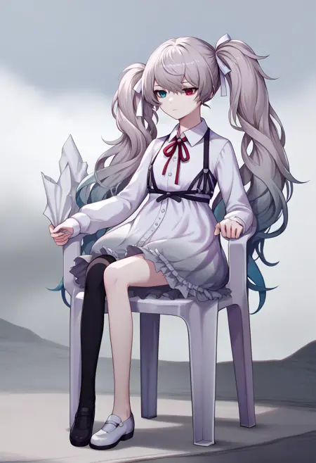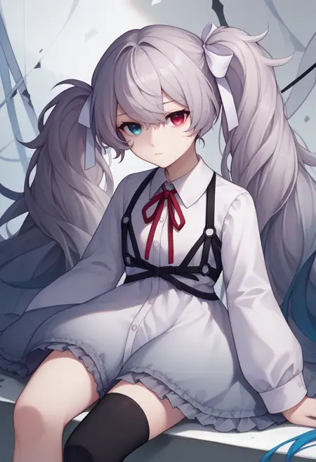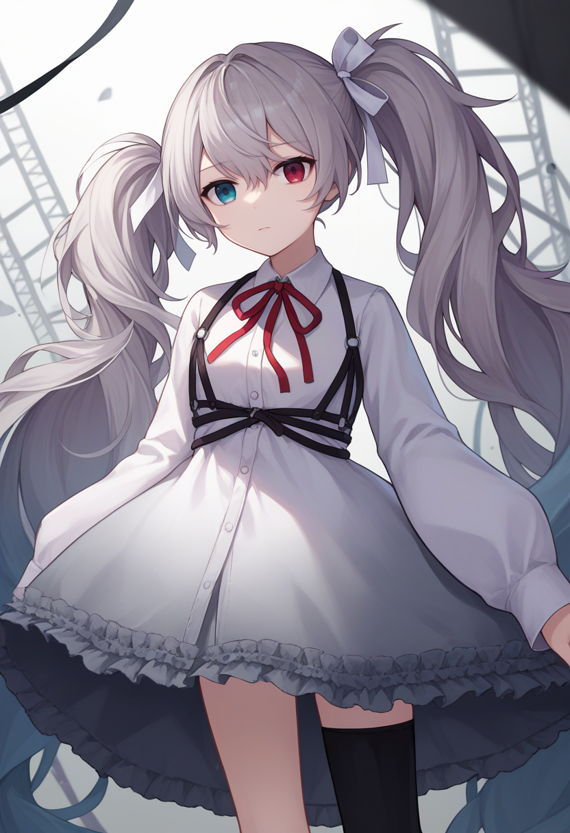 触发词 + 外貌: 25-jimiku, 灰色头发, 双马尾, 发带, 异色瞳, 蓝色眼睛, 红色眼睛