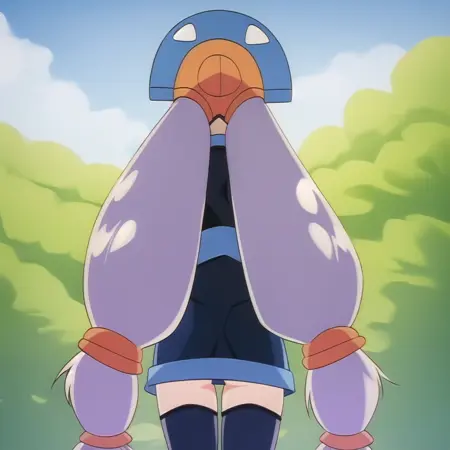 orange helmet, blue headwear, glasses, purple hair, twintails, low-tied long hair, zettai ryouiki, thigh boots, purple eyes
