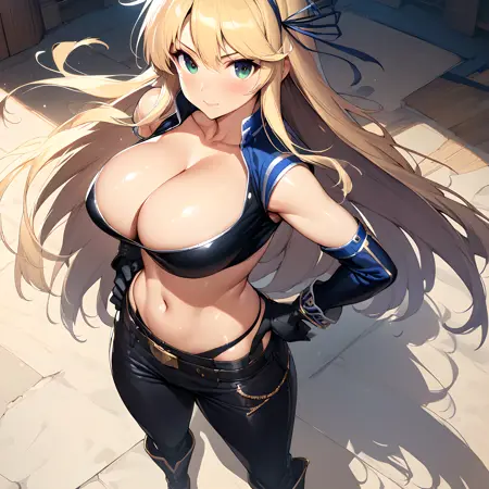 IllustriousXL 激活标签为 "katsuragi(sk)",外观标签为 "长发,金发,大乳房,绿眼",可选 "蓝眼",服装标签为 "defaultoutfit, 蓝色短裙,敞开衣物,领带,开襟衬衫,衬衫,蓝色领带,花瓣,丝带,短袖,肚脐,松散袜子,棕色鞋子"。