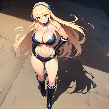 IllustriousXL 激活标签为 "katsuragi(sk)",外观标签为 "长发,金发,大乳房,绿眼",可选 "蓝眼",服装标签为 "defaultoutfit, 蓝色短裙,敞开衣物,领带,开襟衬衫,衬衫,蓝色领带,花瓣,丝带,短袖,肚脐,松散袜子,棕色鞋子"。