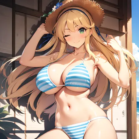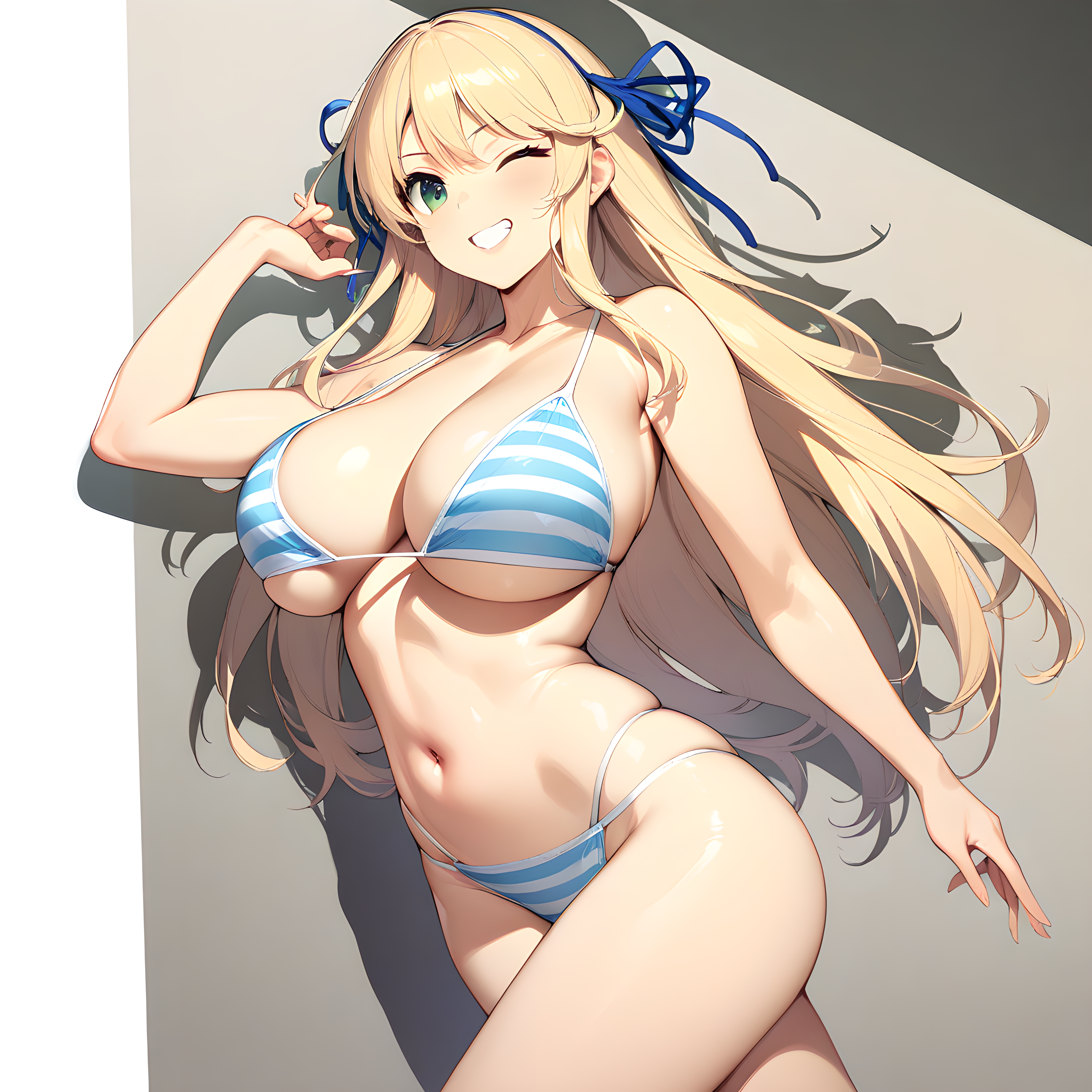 Animagine XL 激活标签为 "katsuragi",外观标签为 "金发,长发,绿眼,大乳房",默认服装标签为 "originaloutfit, 蓝色领带,领带,丝带,发带,衬衫,敞开衣物,开襟衬衫"。