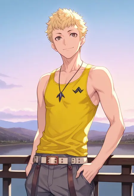 ryuji, 1boy, male focus solo, brown eyes, blonde hair, short hair, tank top, yellow tank top, jewelry, necklace, belt, pants, capri pants, grey pants, shoes, sneakers, blue footwear,