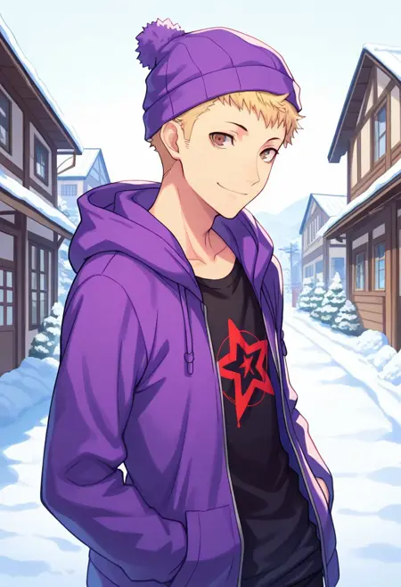 ryuji, 1boy, male focus solo, brown eyes, blonde hair, short hair, hoodie, purple hoodie, hood, open hoodie, open clothes, shirt, black shirt, pants, black pants, shoes, sneakers, yellow footwear,