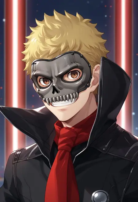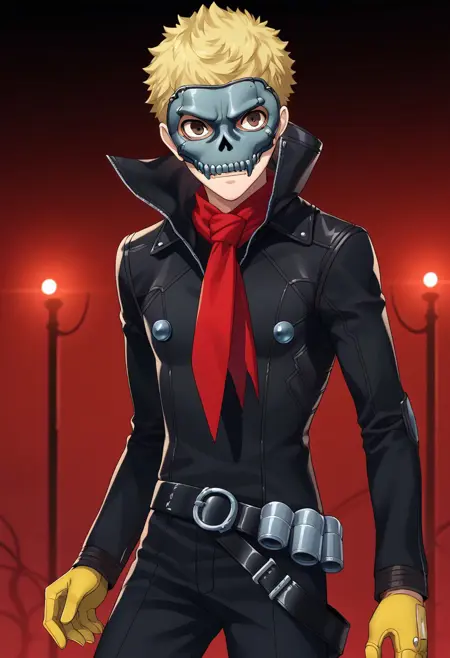 ryuji, 1boy, male focus solo, brown eyes, blonde hair, short hair, skull outfit, mask, skull mask, jacket, black jacket, high collar, leather jacket, leather, scarf, red scarf, gloves, yellow gloves, belt, pants, black pants, knee pads, shoes, black footwear,