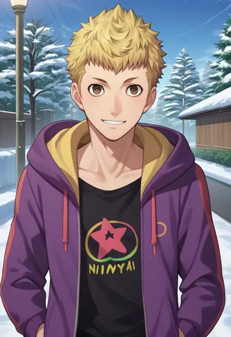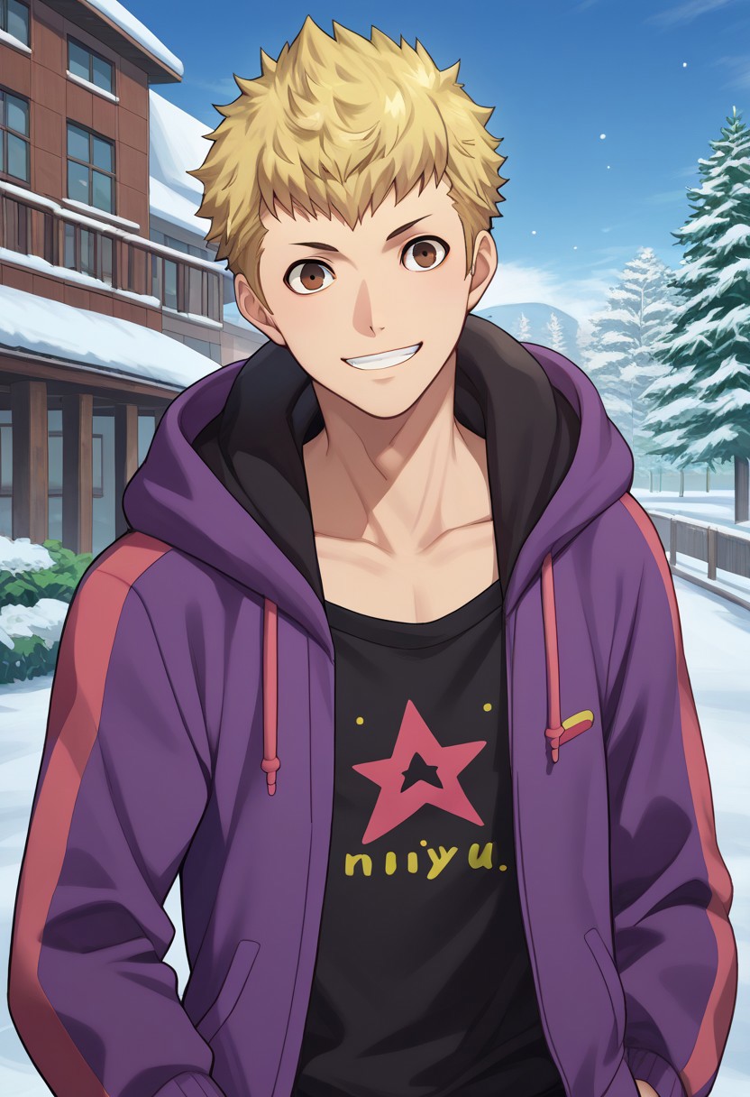 ryuji, 1boy, male focus solo, brown eyes, blonde hair, short hair, hoodie, purple hoodie, hood, open hoodie, open clothes, shirt, black shirt, pants, black pants, shoes, sneakers, yellow footwear,