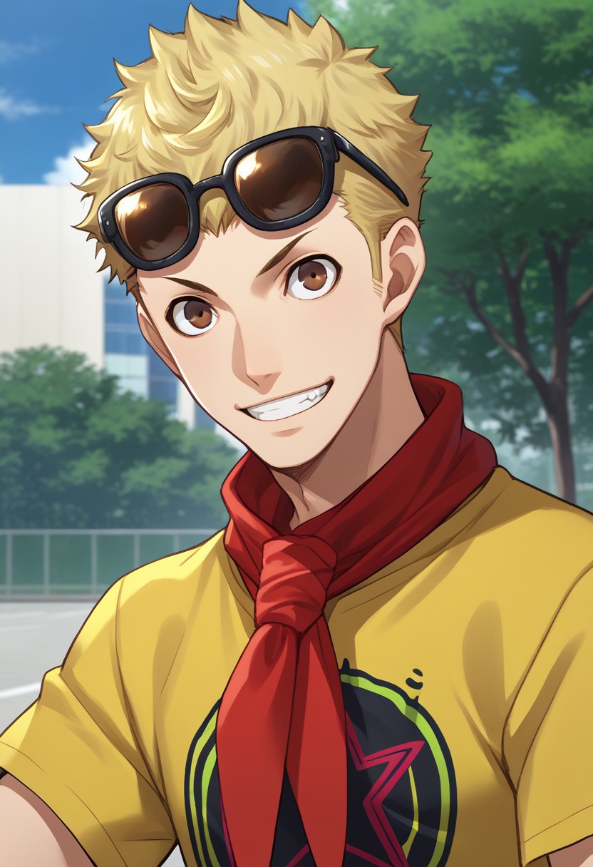 ryuji, 1boy, male focus solo, brown eyes, blonde hair, short hair, sunglasses, eyewear on head, shirt, t-shirt, yellow shirt, print shirt, short sleeves, scarf, red scarf, belt, pants, plaid, plaid pants, shoes, yellow footwear, jewelry, bracelet,