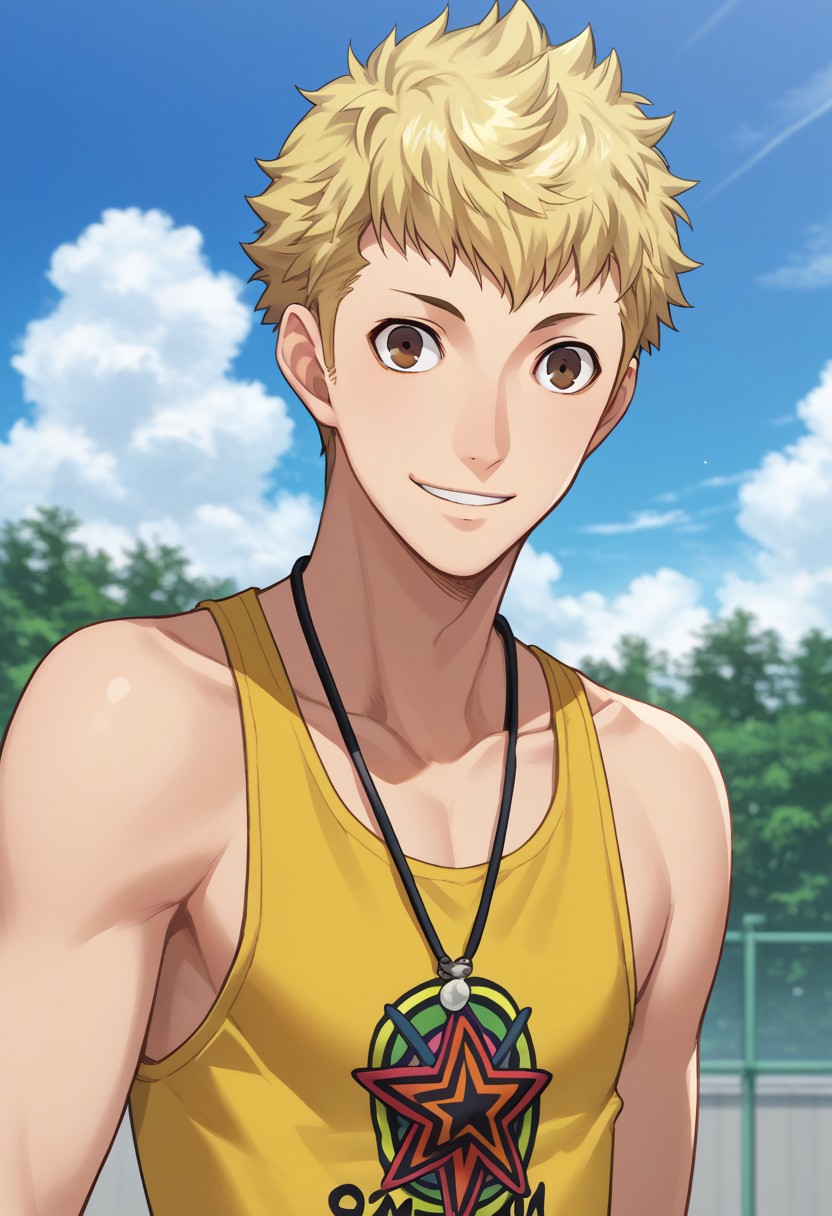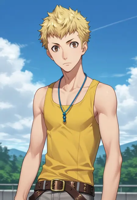 ryuji, 1boy, male focus solo, brown eyes, blonde hair, short hair, tank top, yellow tank top, jewelry, necklace, belt, pants, capri pants, grey pants, shoes, sneakers, blue footwear,