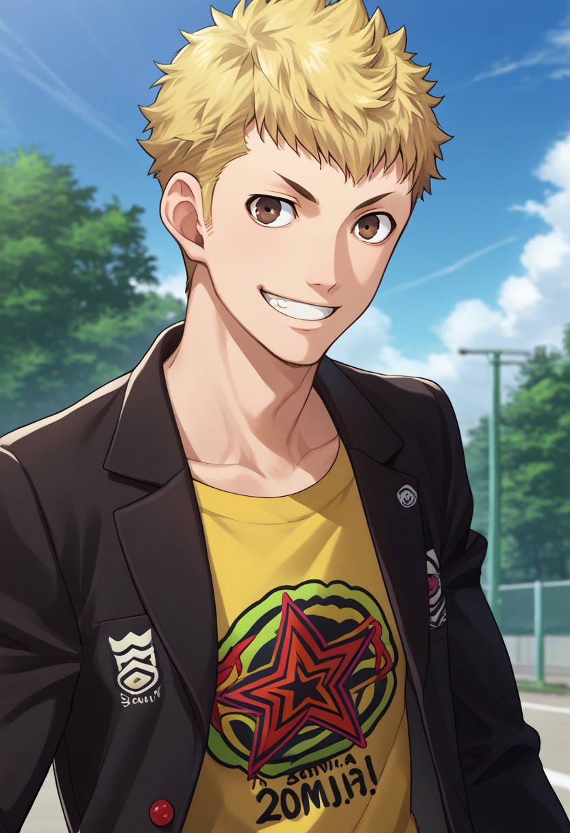 ryuji, 1boy, male focus solo, brown eyes, blonde hair, short hair, school uniform, shirt, yellow shirt, print shirt, jacket, black jacket, long sleeves, open jacket, open clothes, belt, pants, plaid, plaid pants, pants rolled up, shoes, sneakers, white footwear,