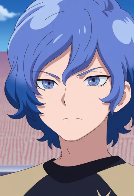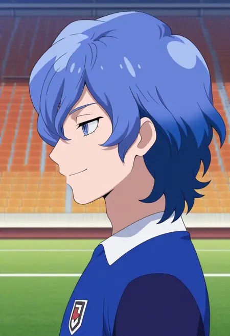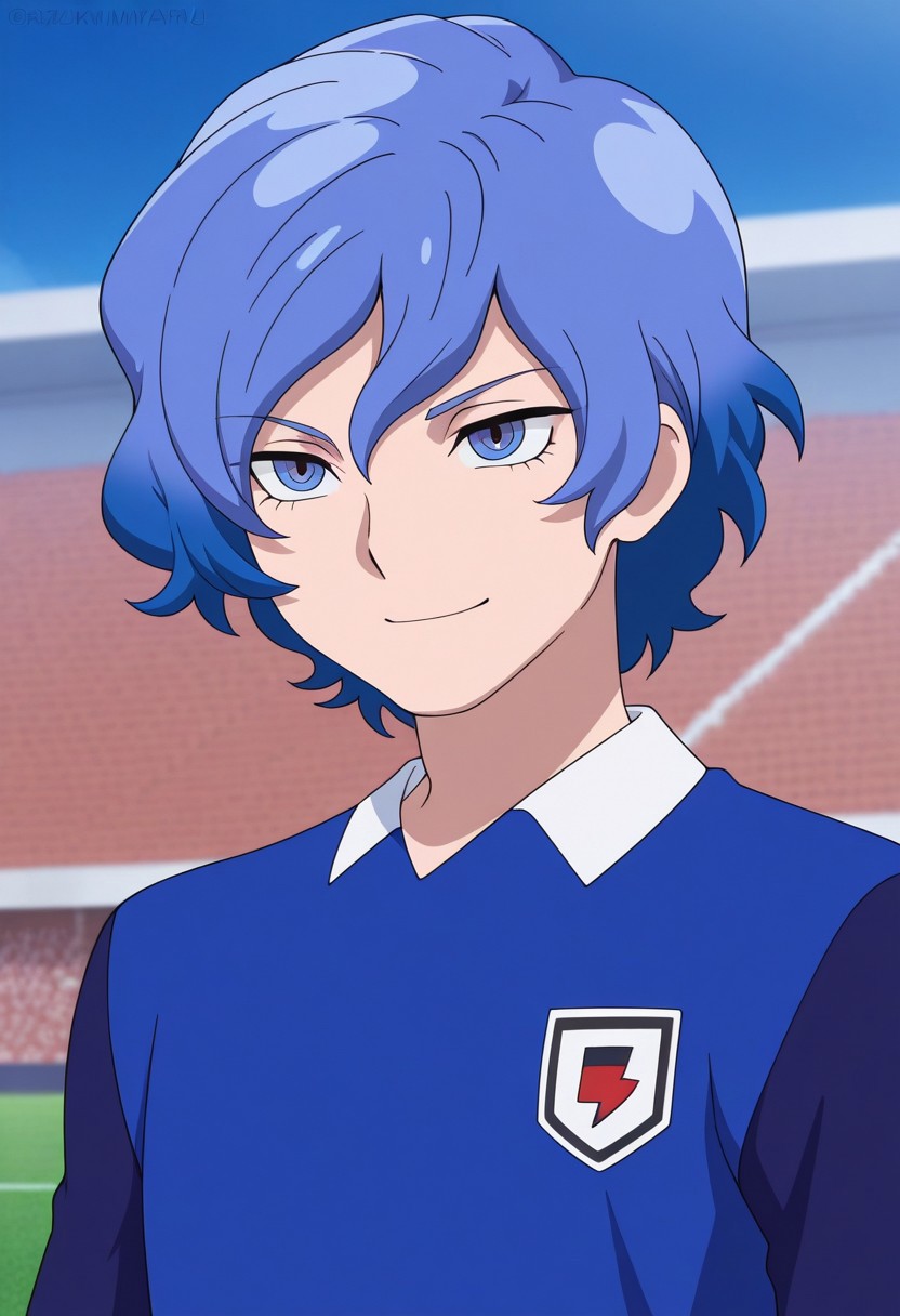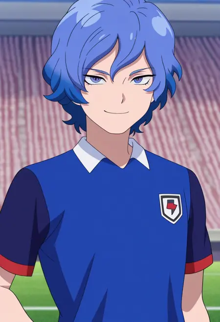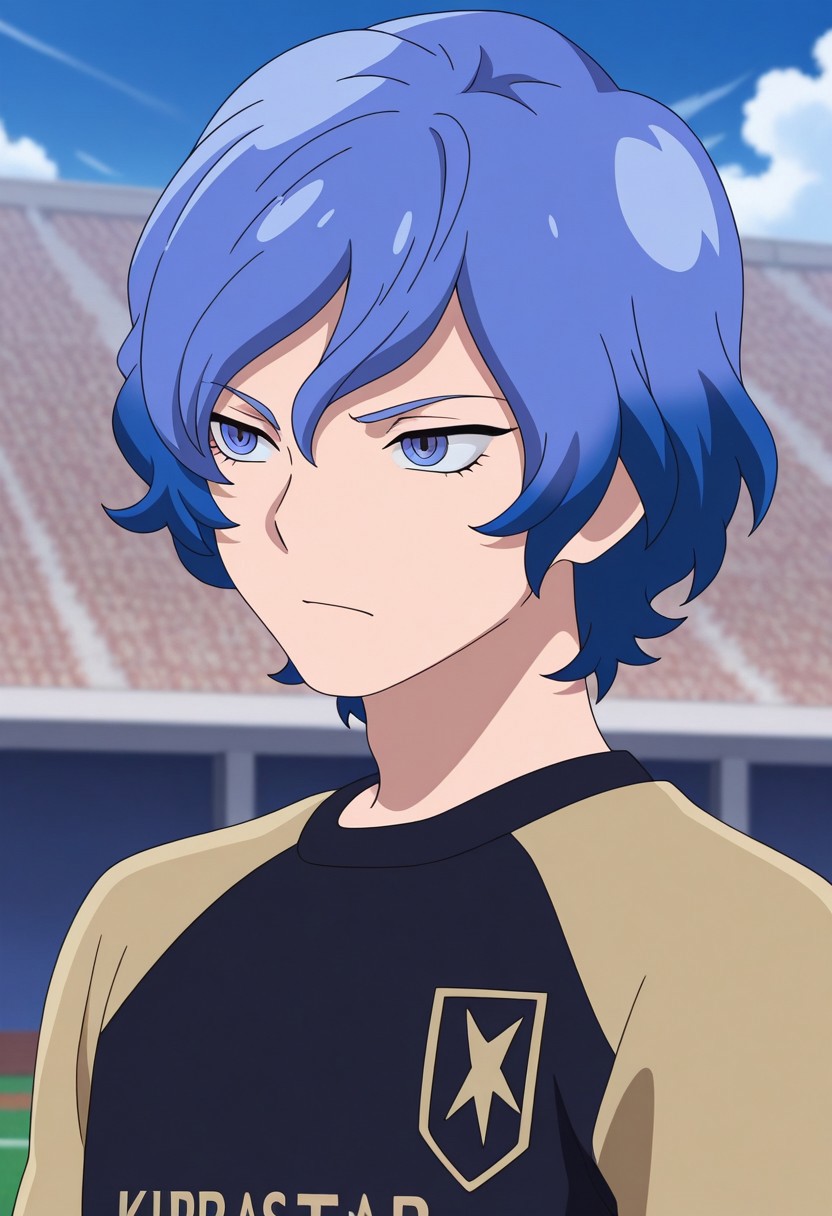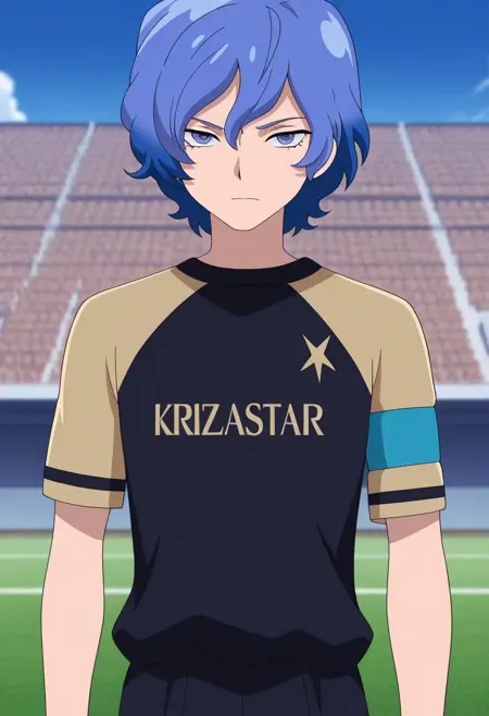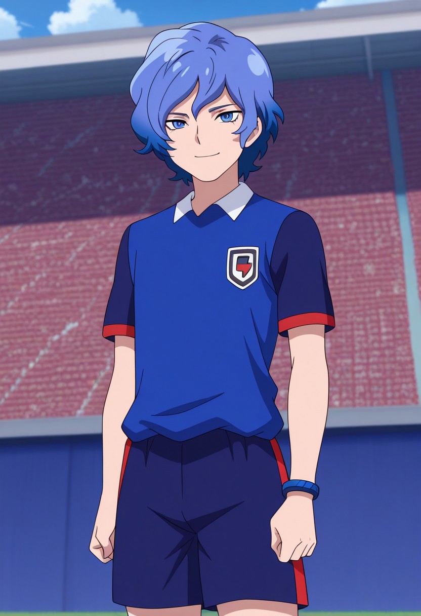 MizukamiyaSeiryuu, 1男孩, 男性焦点, 单人, 蓝色眼睛, 蓝色头发, 猎户座足球制服, 衬衫, 蓝色衬衫, 肩袖, 短袖, 手镯, 短裤, 蓝色短裤, 袜子, 蓝色袜子, 鞋子, 运动鞋