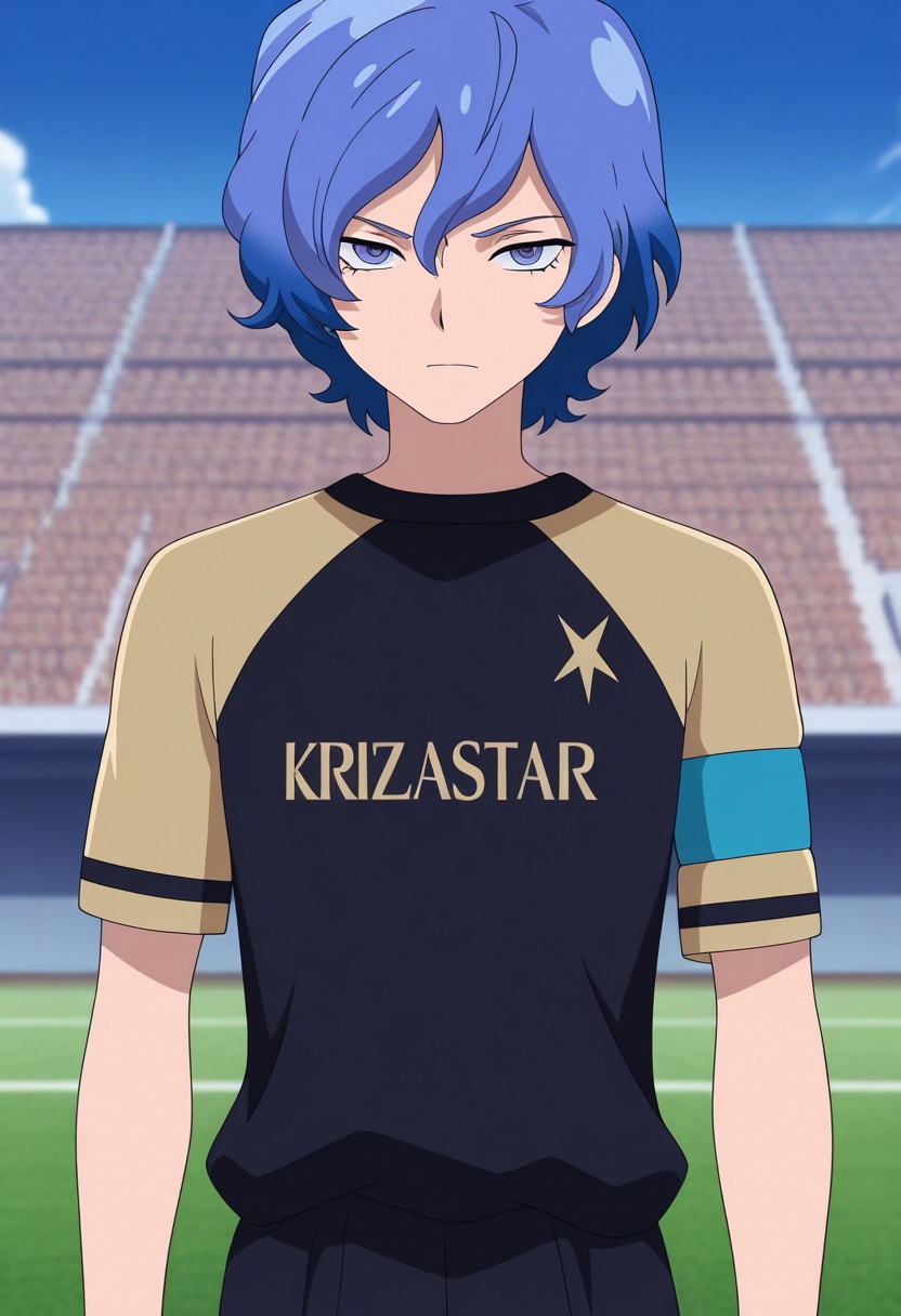 MizukamiyaSeiryuu, 1男孩, 男性焦点, 单人, 蓝色眼睛, 蓝色头发, 青翔足球制服, 黑金衬衫, 多色衬衫, 袖带, 短袖, 手镯, 短裤, 黑色短裤, 袜子, 蓝色袜子, 鞋子, 运动鞋