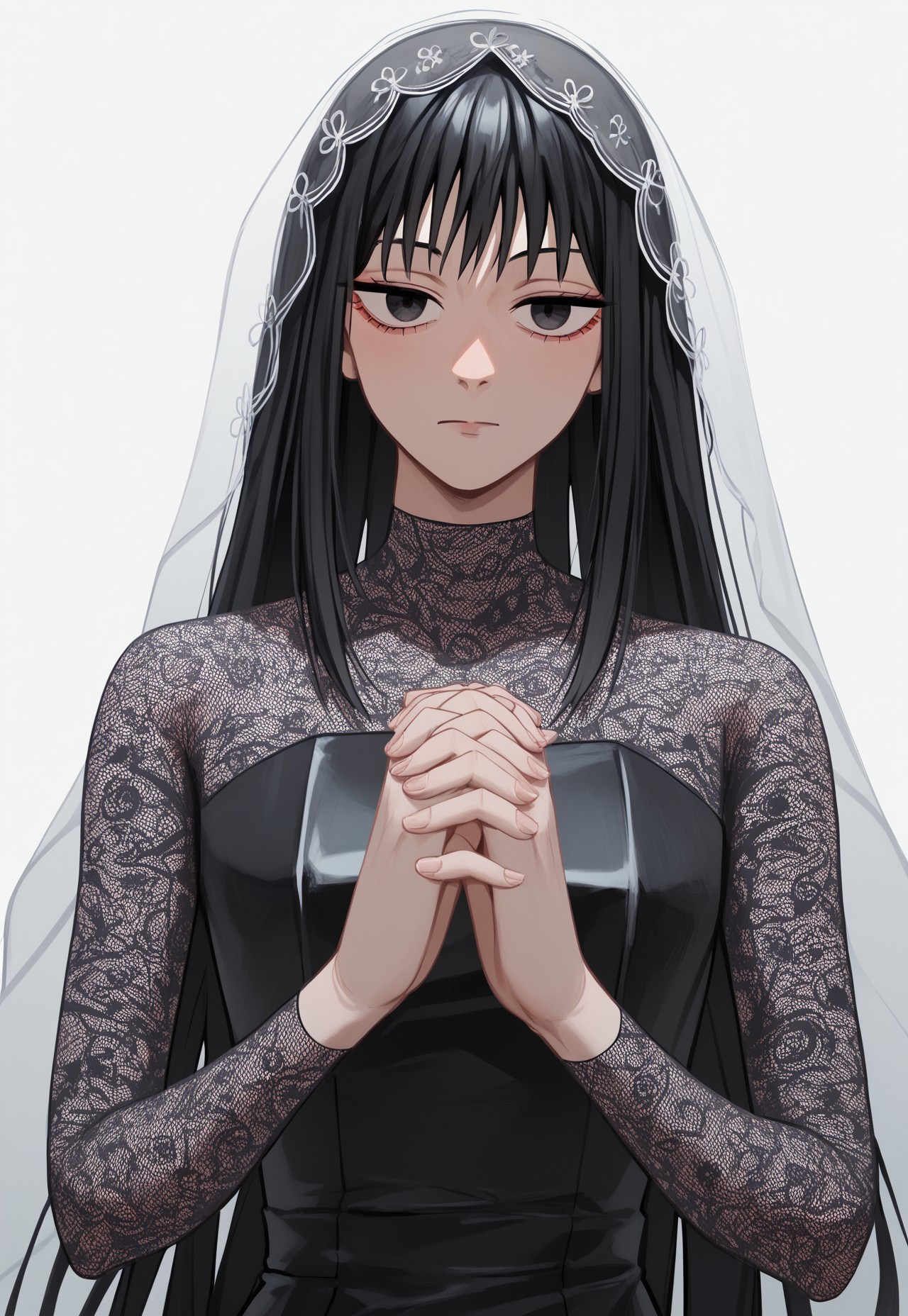 osaragi, osaragi (sakamoto days), black hair, long hair, black eyes, veil, black dress, stockings, black dress shoes