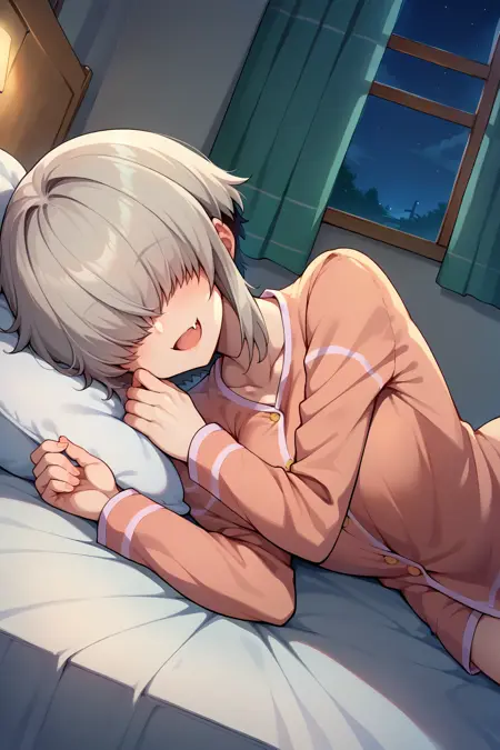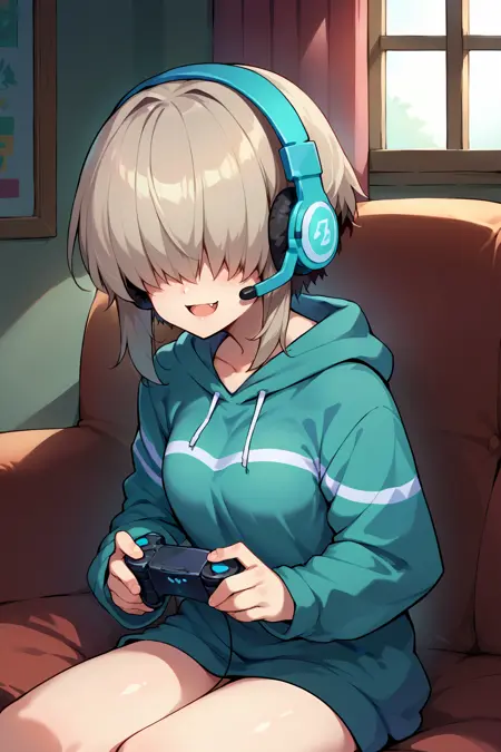 キャラクターのトリガー:ynguzk、fang、目を隠した、長い髪の束のある短い髪