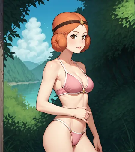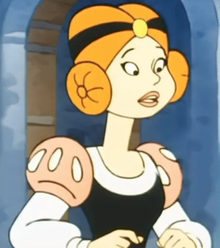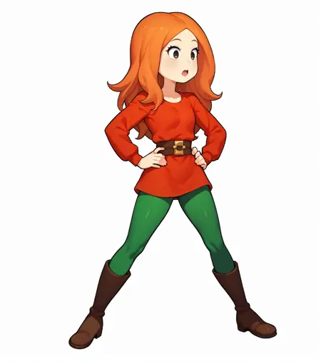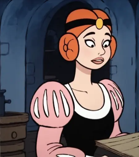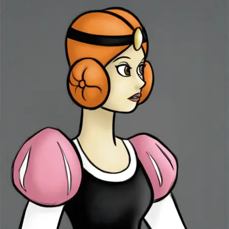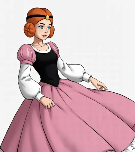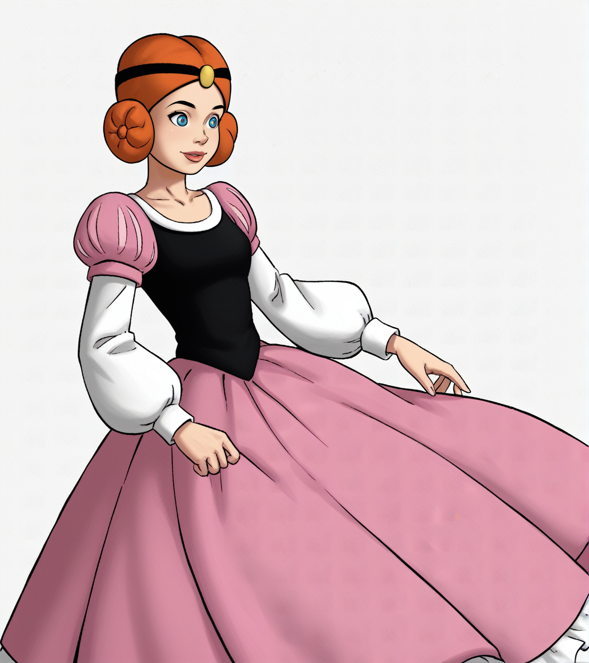 태그: 빨간 머리, 공주복, 기고트 소매와 페티코트가 있는 부프 풀스커트, 옆머리 둥글게 묶음, 갈색 눈 OR 점 모양 동공, 검은 동공.