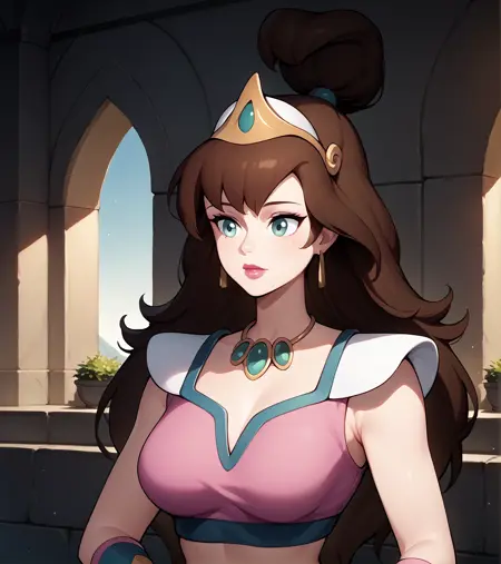 Tags: lana, long brown hair, green eyes, two-piece short dress, midriff, jewels, gauntlets, boots, tiara, cartoon, source_cartoon, retro_artstyle, screencap,
