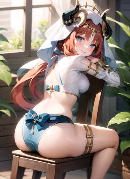 lyco:sitchair-000019:1.0, sitaway, lyco:nilou1-000008:1, niloudef, 脸红, 女性为主, 直视观众, 微笑, 反向坐着,