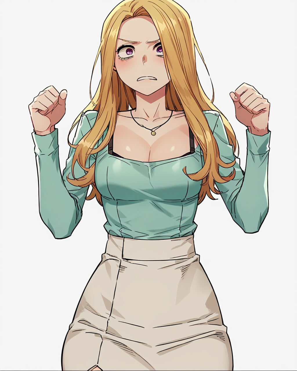 green shirt, black bra, cleavage, long sleeves, necklace, beige skirt, black panties