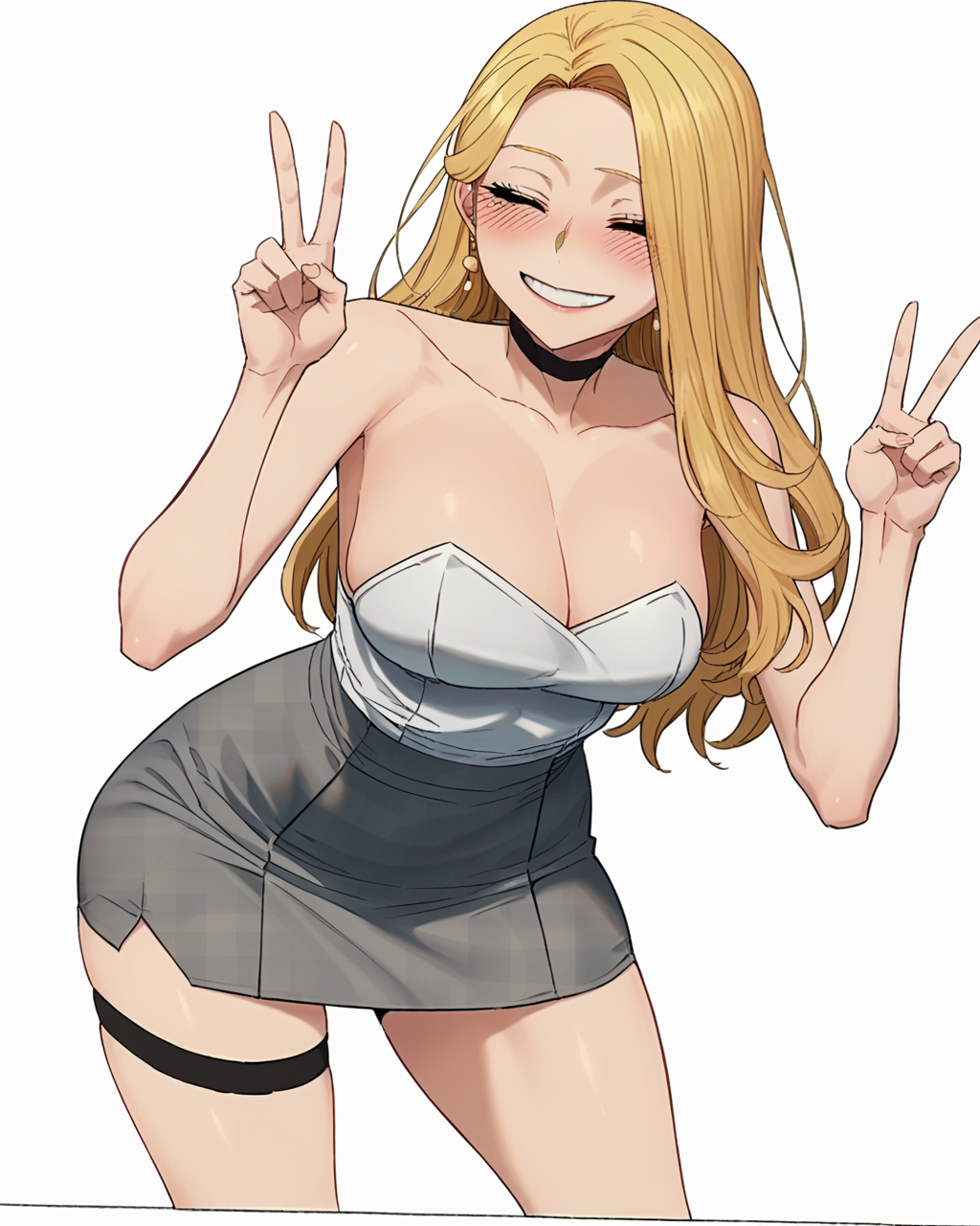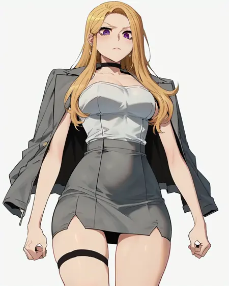 black choker, cleavage, white top, sleeveless, bare shoulders, grey skirt, pencil skirt, black garter